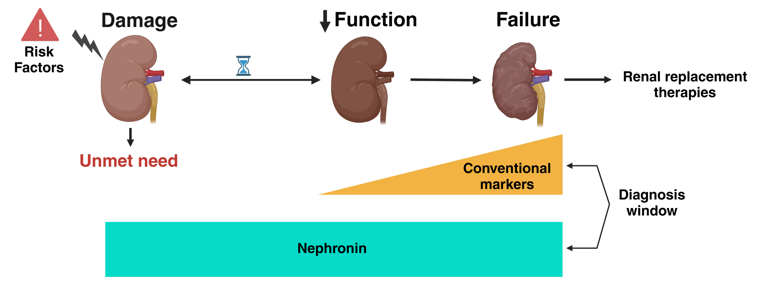 Kidney disease is called a “silent killer” because it often shows no symptoms. This makes it hard for patients, as early detection is crucial to prevent kidney failure. Conventional markers often miss early kidney damage, leading to delayed diagnosis after significant function loss. There is a need for non-invasive, sensitive biomarkers to expand the diagnosis window. Nephronin® seeks to complement the traditional markers for earlier detection and improved patient outcomes.